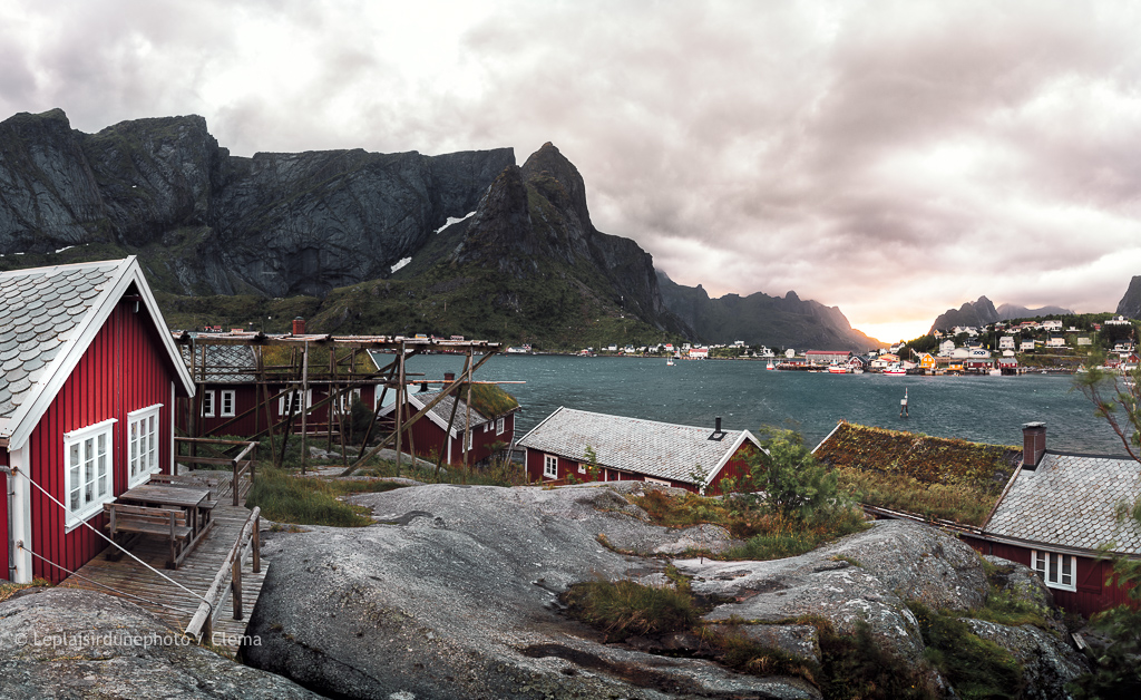Nous sommes un peu excités mais complètement hors-circuits pour vraiment profiter. Nous rejoignons notre van les yeux errant sur ce bout de terre à l’approche mais il est encore bien tôt et le ciel est couvert. Nous faisons ronronner le moteur et hop nous prenons possession des routes microscopiques de Mosekenes, point de chute des arrivées du sud des îles Lofoten ! Mais on est vraiment fatigués, les 4 heures de sommeil entrecoupées ont raison de tout. On conduit sans trop savoir où aller, direction Reine, petit village au sud des îles, cité dans les guides. A peine quelques kilomètres plus tard, nous ne luttons plus et cherchons juste un endroit où garer notre lit. Pas facile ! Les routes de villages sont en une voie et il s’agit de villages longeant l’eau où il n’y a pour le moment qu’une rue principale, bordée de petites maisons rouges. Tout est petit, on erre un peu, Clément part de temps en temps en éclaireur car les virages de ces ruelles sont étroits. On dirait que tout est en miniature, comme dans un décor de poupée !
