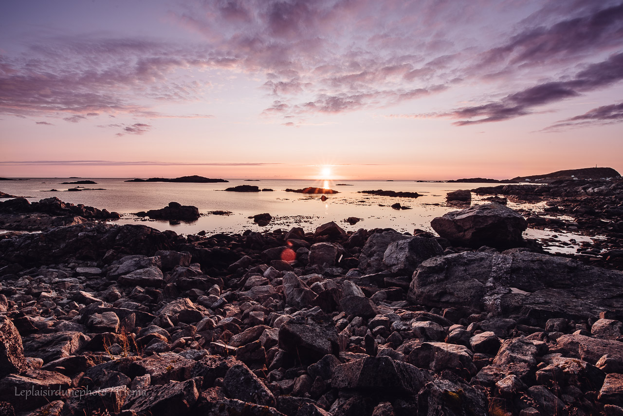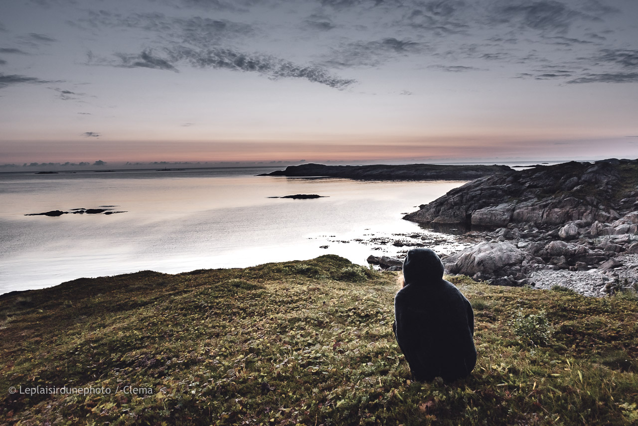 Je vais me poser au café au nom imprononçable « Ekspedisjonen Restaurant & Kafebar i Vertsbrygga », près des bateaux, le soleil sonne la fin de l’après-midi et Clément me rejoint. C’est une superbe après-midi. On prend des cafés, on geek un peu. On est tenté de se faire un plat mais c’est toujours hors de prix. Pour un port abandonné, le café-restaurant est pour le coup assez moderne, bien entretenu. Sans concurrence, il n’y a pas de problème pour remplir l’espace des quelques habitants et des touristes. La ville de ce qu’on lit semble se réveiller de ses cendres progressivement. Nous quittons ces quelques personnes, quelques ruelles dans notre van, mais le coucher de soleil émergeant nous provoque déjà un arrêt d’observation. A quelques mètres plus loin, rebelotte. Cette fois-ci les couleurs sont très douces, beaucoup moins agressives que la dernière fois. Nous décidons d’en profiter complètement et trouvons très vite un espace pour garer le van. Le shooting commence, on prend des images pour le film même tellement c’est beau. Nous laisserons le van là pour cette nuit. Je cuisine dans le coffre face à l’eau et les couleurs filantes, une soirée qui est devenue une habitude. Il ne reste plus beaucoup de soirées de ce type, on les savoure d’autant plus.