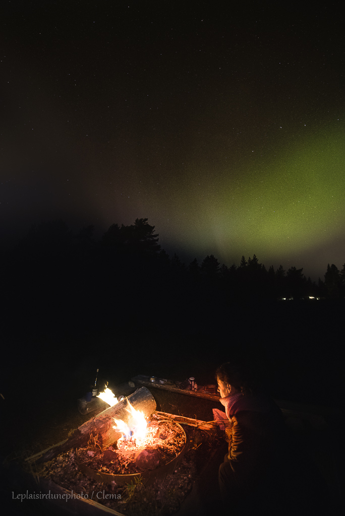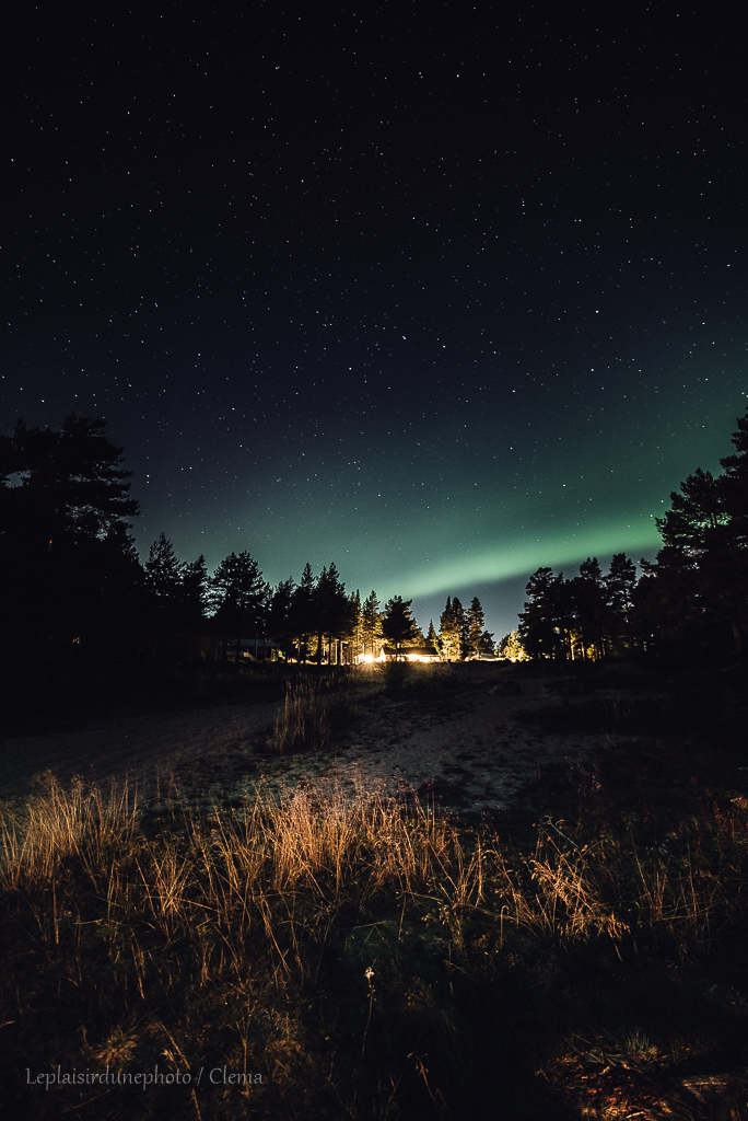Et là je LA vois. Ondulante, comme pluie dans le ciel, certes peu puissante mais bien présente avec une dominante verte et ces teintes violettes : une aurore boréale. Nous aurons le droit à une nouvelle nuit d’aurores. Quelle chance ! Et pourtant nous avons dépassé le cercle polaire ! Je pars récupérer mon appareil photo pour ne pas en perdre une miette.