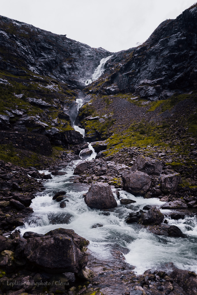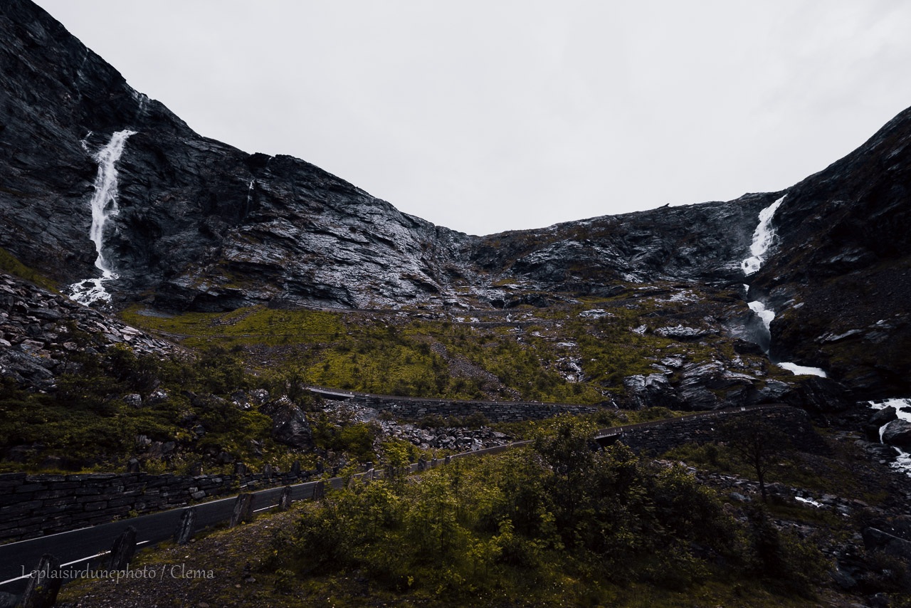Et puis, et puis, oooooooooohhhhhh Trollstigen, la route des Trolls ! La voilà dis donc ! 625 mètres au dessus du fjord, commence une belle descente de 10% de dénivelé, qui cumule 11 virages en épingle à cheveux, le long d’une chute d’eau de 180 mètres de hauteur ! Rien que ça ! Facile !