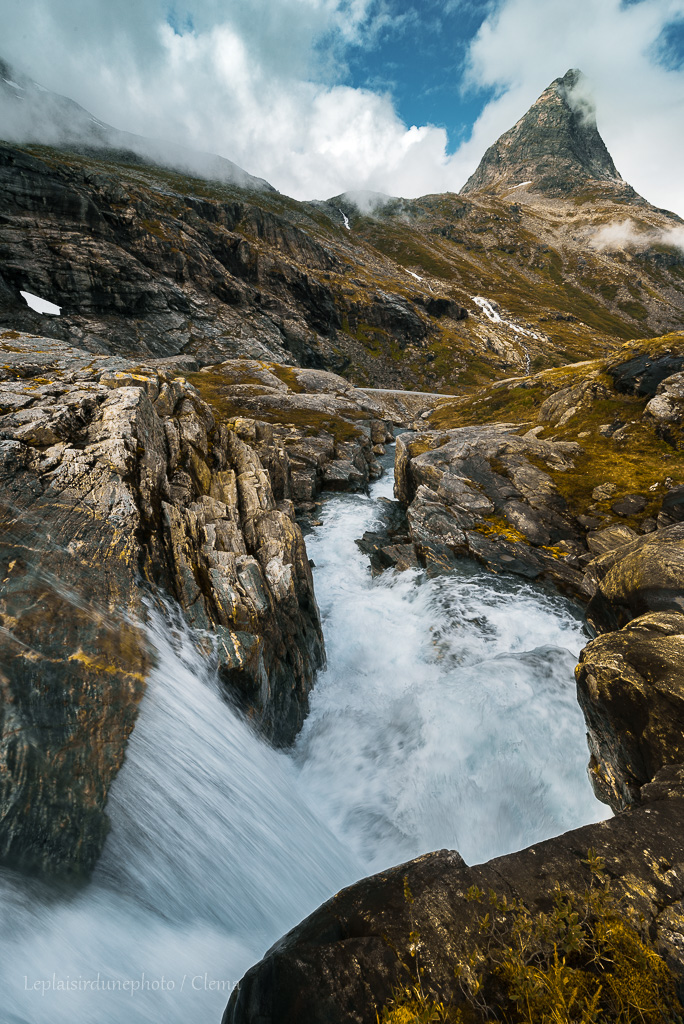 Ce matin, notre petite place de parking en plein point de vue est envahie par les touristes. Ni une, ni deux, on lève les voiles pour descendre voir si Geiranger est aussi jolie du bas que du haut. On remarque de loin des sentiers de randonnées, on regarde un peu mais il y a beaucoup d’agitation. Des ferries énormes prennent place dans le fjords à côté de stands de tourisme qui fleurissent à gogo. A ce moment là, nous nous rendons compte d’un phénomène qui s’installe progressivement, nous devenons un peu autistes dans notre bu-bulle. Un sentiment de fuite nous prend tous les deux en même temps. Cela fait 20 jours que nous sommes ensemble H24, à vivre de nature et de photo et le monde nous semble désormais agité. On fuit rapidement cette ambiance et ce monde. Une jolie montée comme je les aime m’attend : la route est abrupte, les virages serrés, étroits et surtout raides, mais la boîte automatique du van fait son boulot ! Nous ne le savons pas encore mais nous nous dirigeons petit à petit vers » Trollstigen « , la route des Trolls !