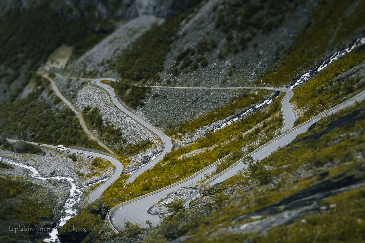 Trollstigen, fermée l’automne et l’hiver, est vertigineuse. D’ailleurs les véhicules de plus de 12 mètres y sont interdits, car ils ne pourraient pas virer. Elle est entourée de trois montagnes : Le roi (Kongen), la Reine (Dronningen) et l’Evêque (Bispen). Bon une petite route de campagne en somme !